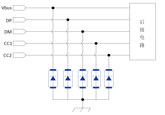 充电功率从5V/3A逐步提升至36V/5A,用于充电功能的关键线路(如USB-A中的Vbus、DP、DM,以及USB-C中的Vbus、DP、DM、CC1、CC2)成为防护的重点。EOS浪涌和ESD可能通过这些线路侵入后级电路,甚至因插拔操作产生的浪涌也可能导致主控芯片损坏。