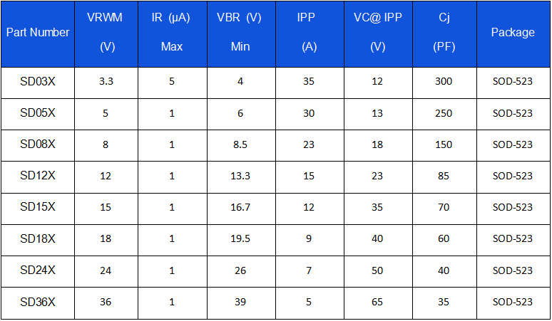 MDD推出的SDxxX系列防护器件,功率覆盖300~450W,具备强大的浪涌防护能力,静电防护可达接触和空气放电±30KV。该系列采用SOD-523贴片小型封装,符合产品小型化需求,适用于各类充电头、电动剃须刀、电动牙刷、小型蓝牙音响等USB充电产品的充电口防护。