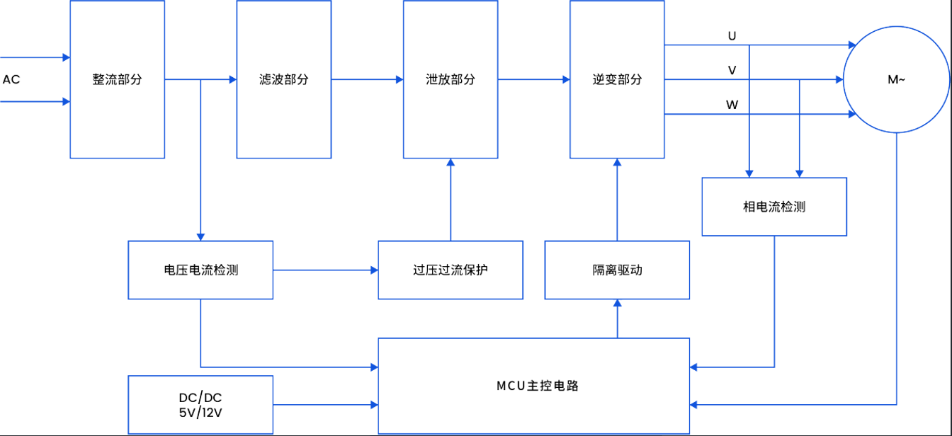 It primarily consists of rectification (AC to DC), filtering, inversion (DC to AC), braking units, drive units, detection units, and microprocessor units.
